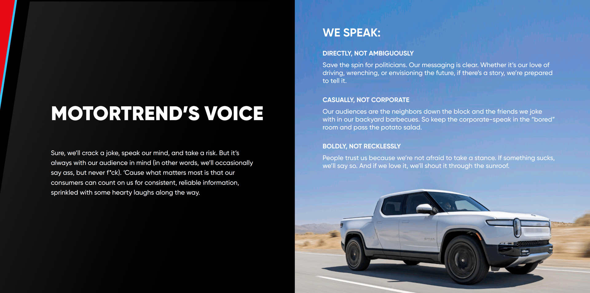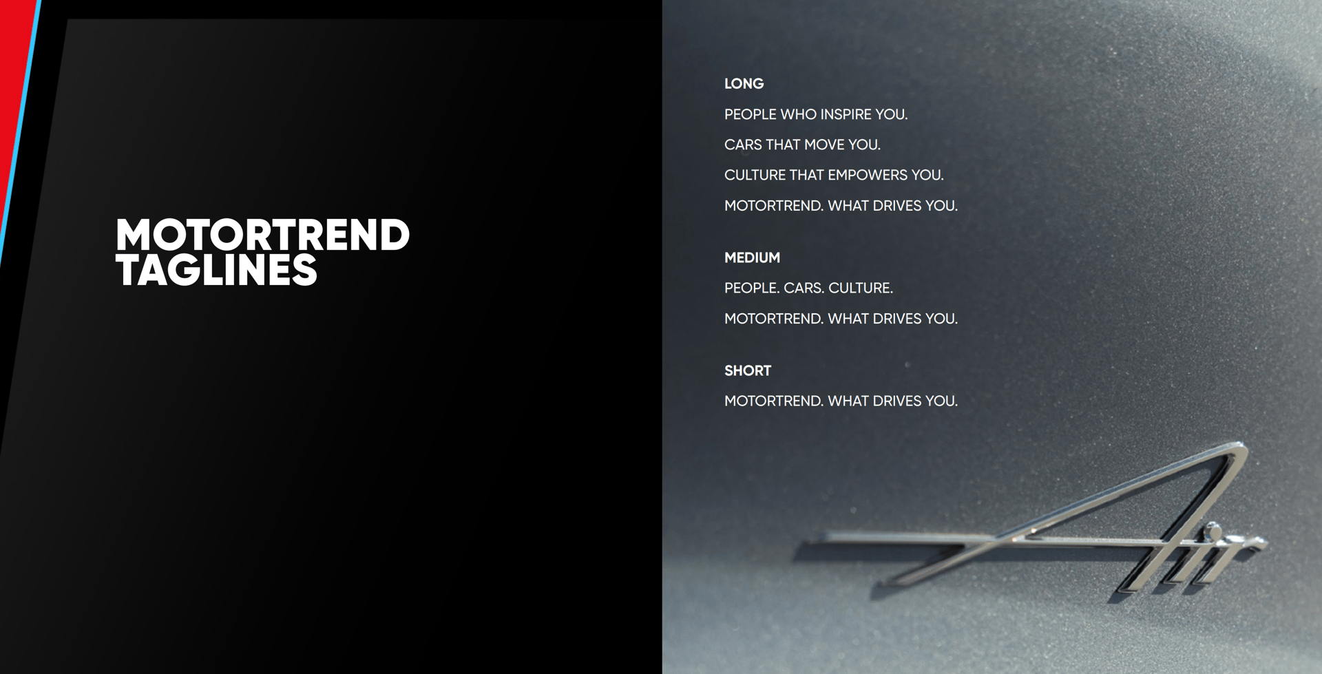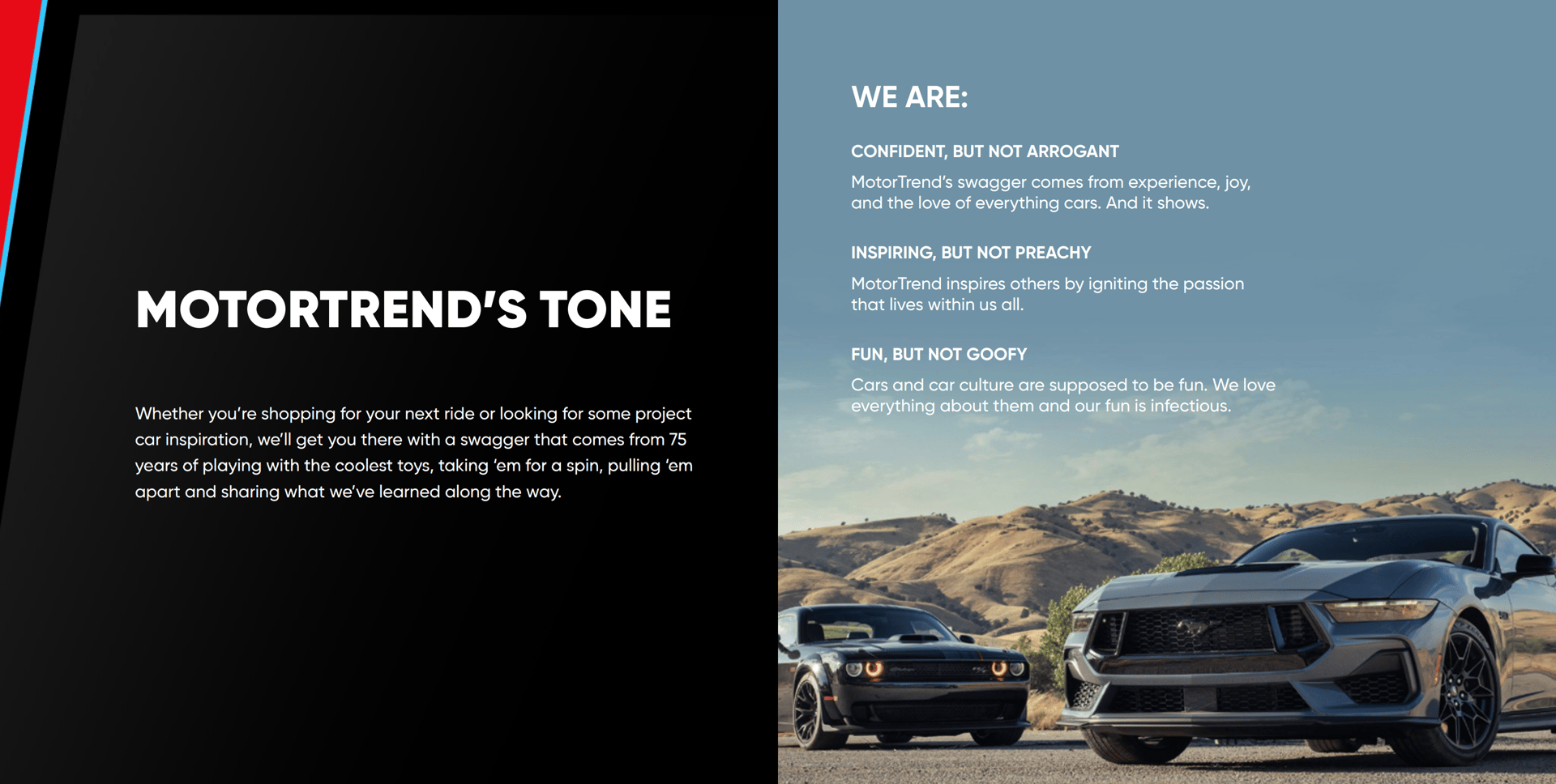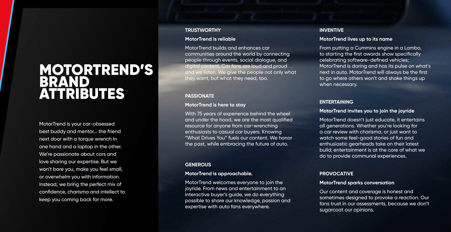 Over the past 75 years, MotorTrend had evolved from a single magazine to its own TV channel, a mobile app, online car shopping tools, and more. I was asked to help define the company's voice, tone, and personality as part of an overall re-branding effort to attract a younger audience.